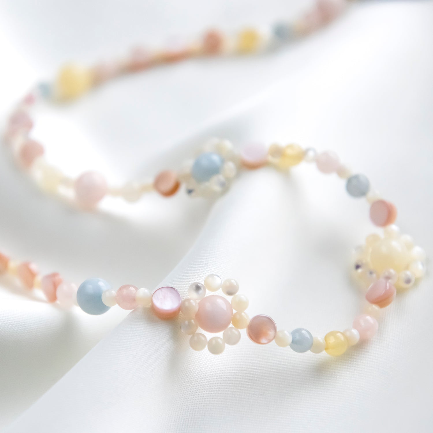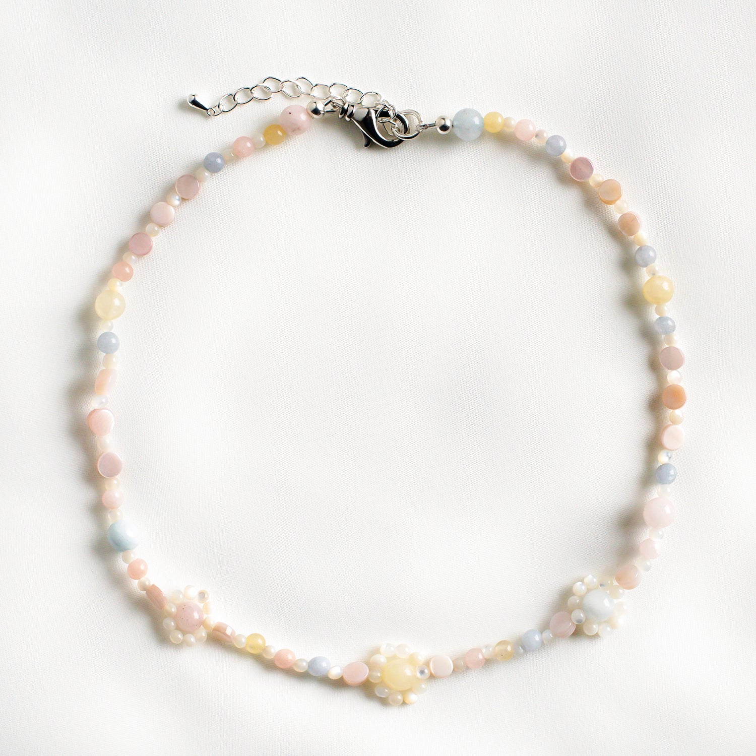 Each piece is unique and handmade, with variations in the placement of the beads.