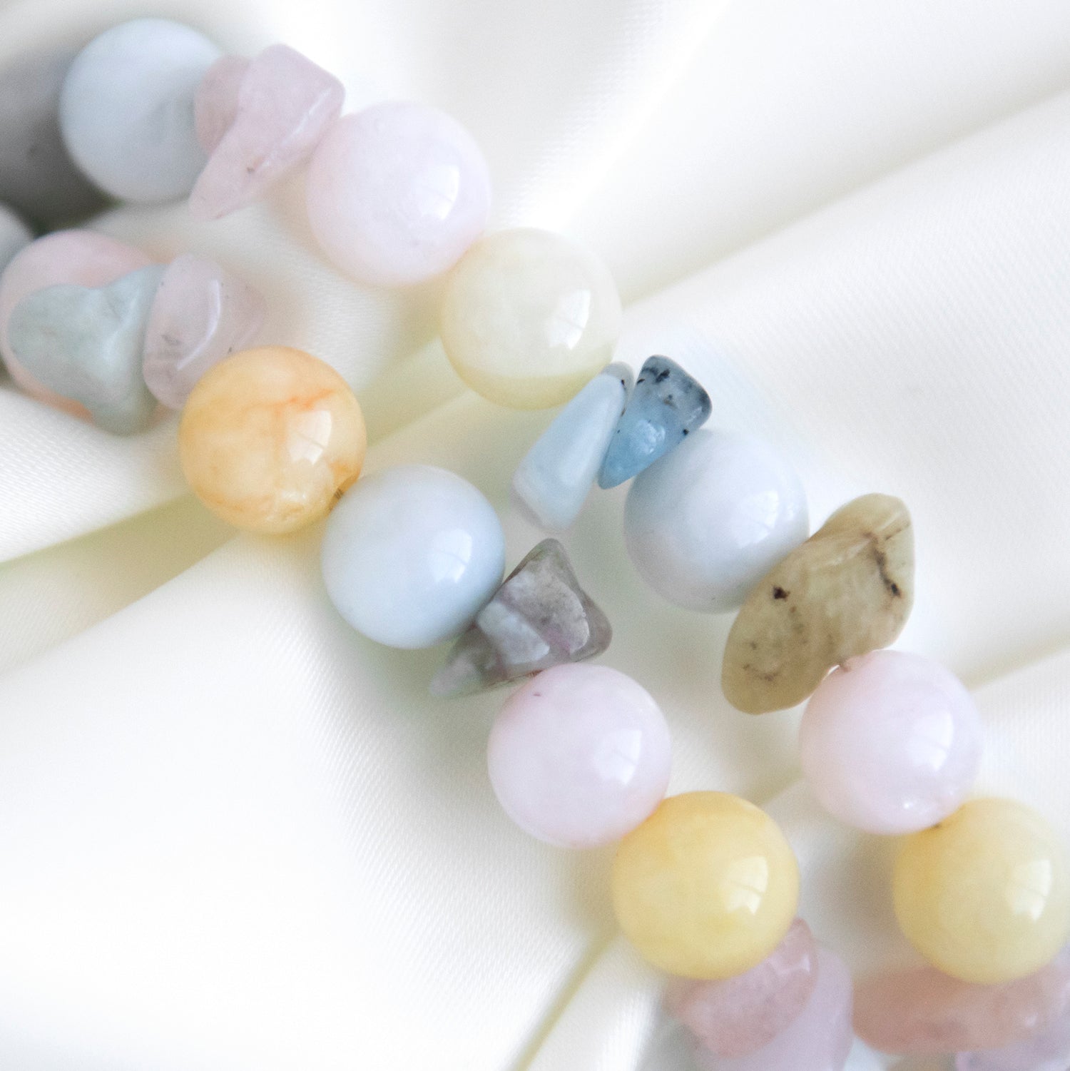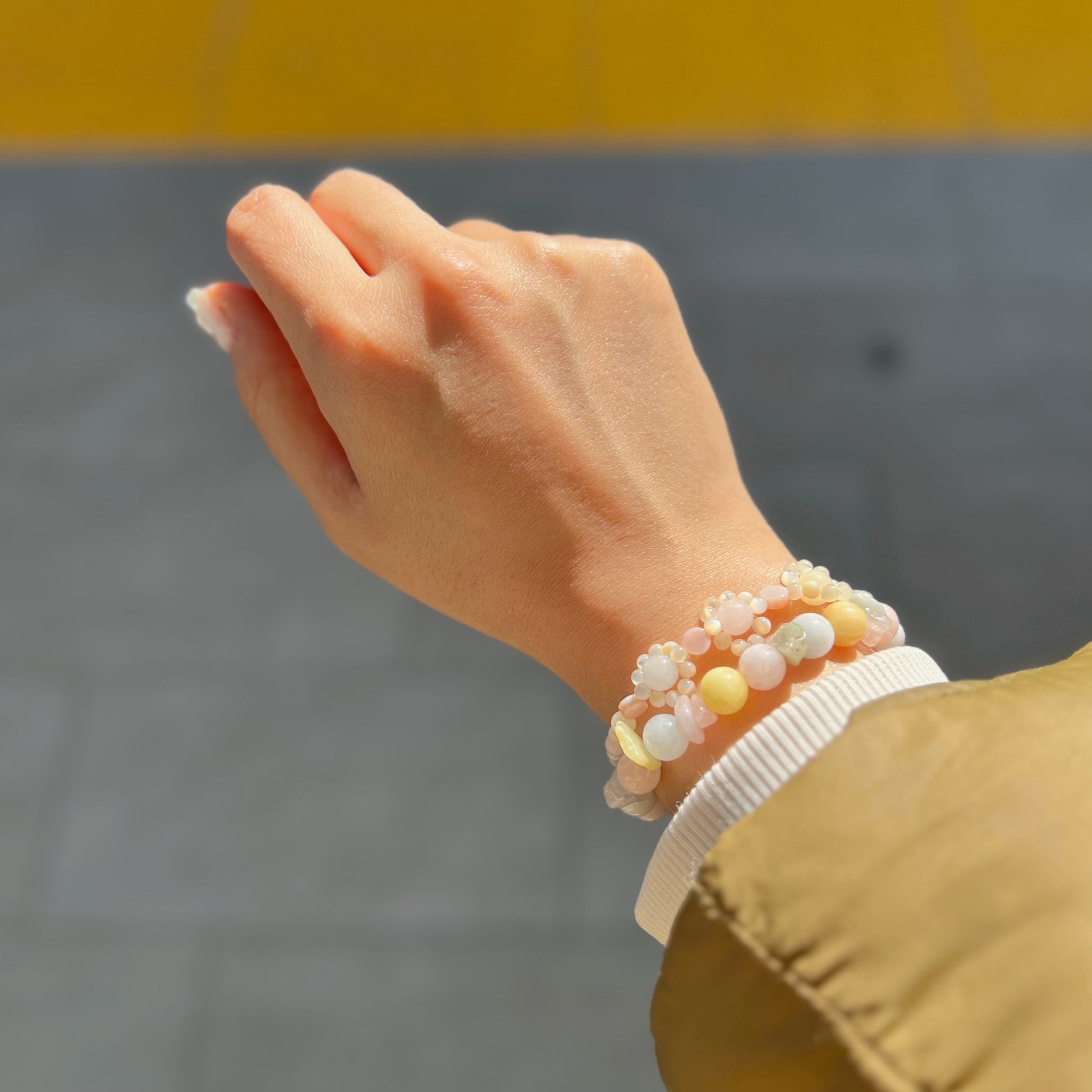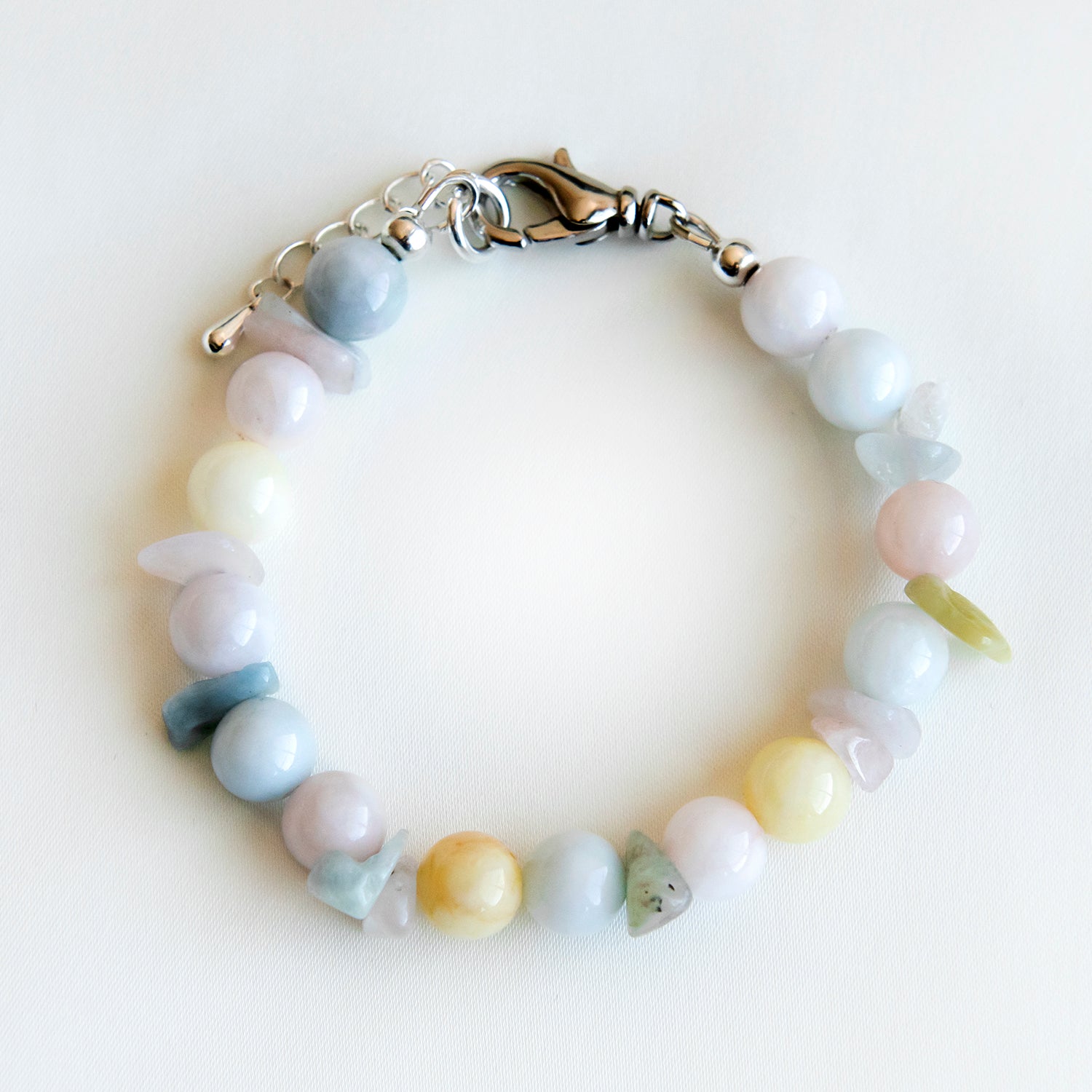 Each piece is unique and handmade, with variations in the placement of the beads.