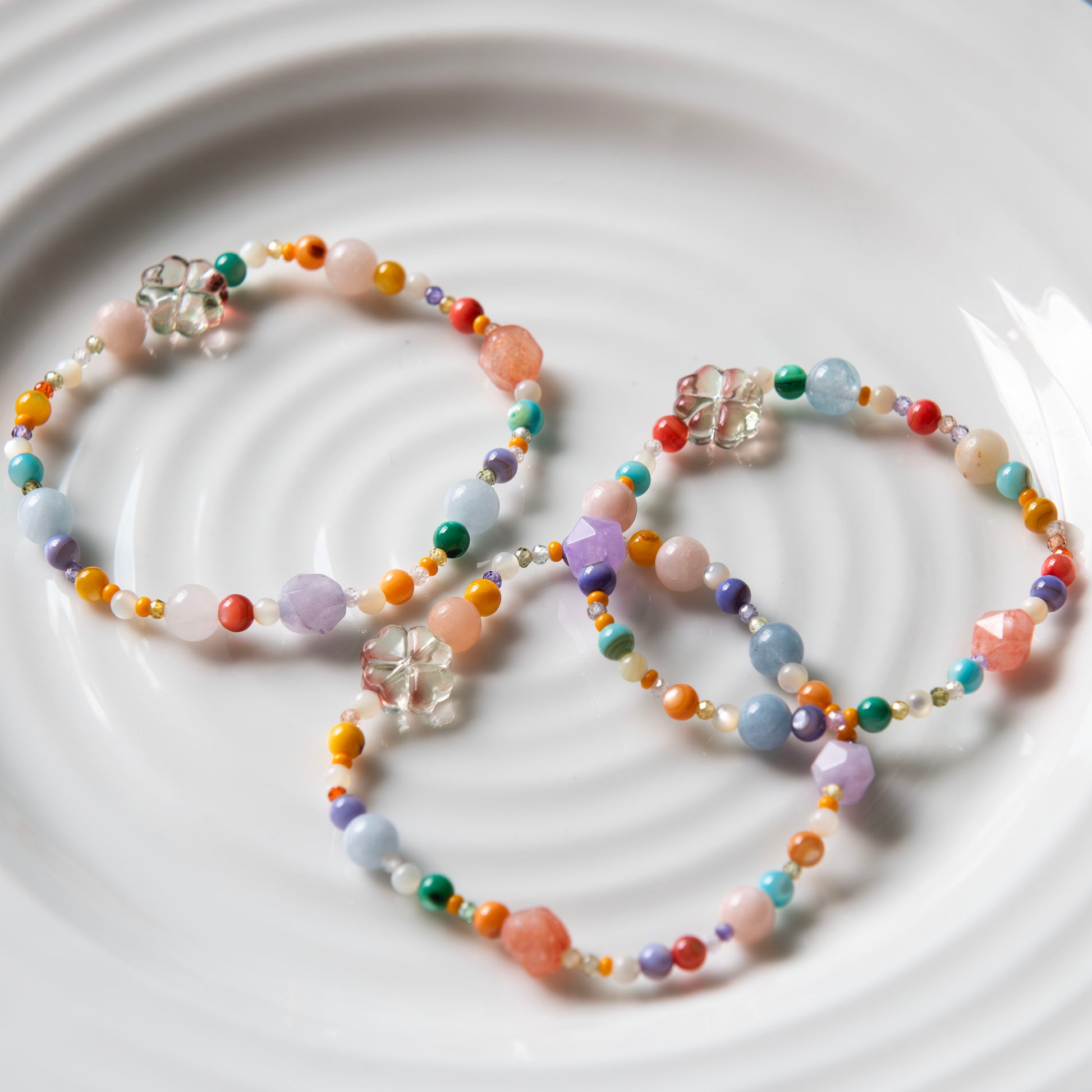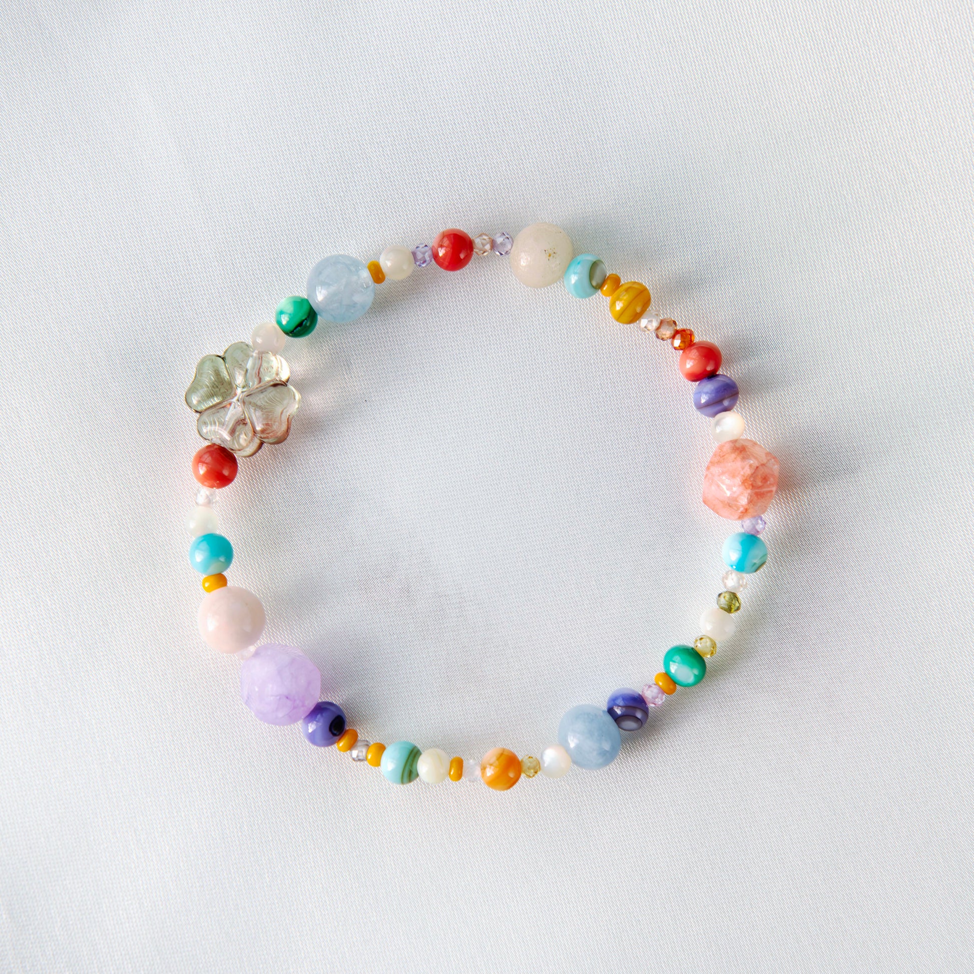 Biht [bit̚] (Light in Korean): Embrace the radiant energy of nature with the Biht Bracelet. Sparkling with quartz, mother of pearl, crystals and glass beads, this bracelet captures the essence of sunlight filtering through leaves and the dazzling beauty of a summer day.