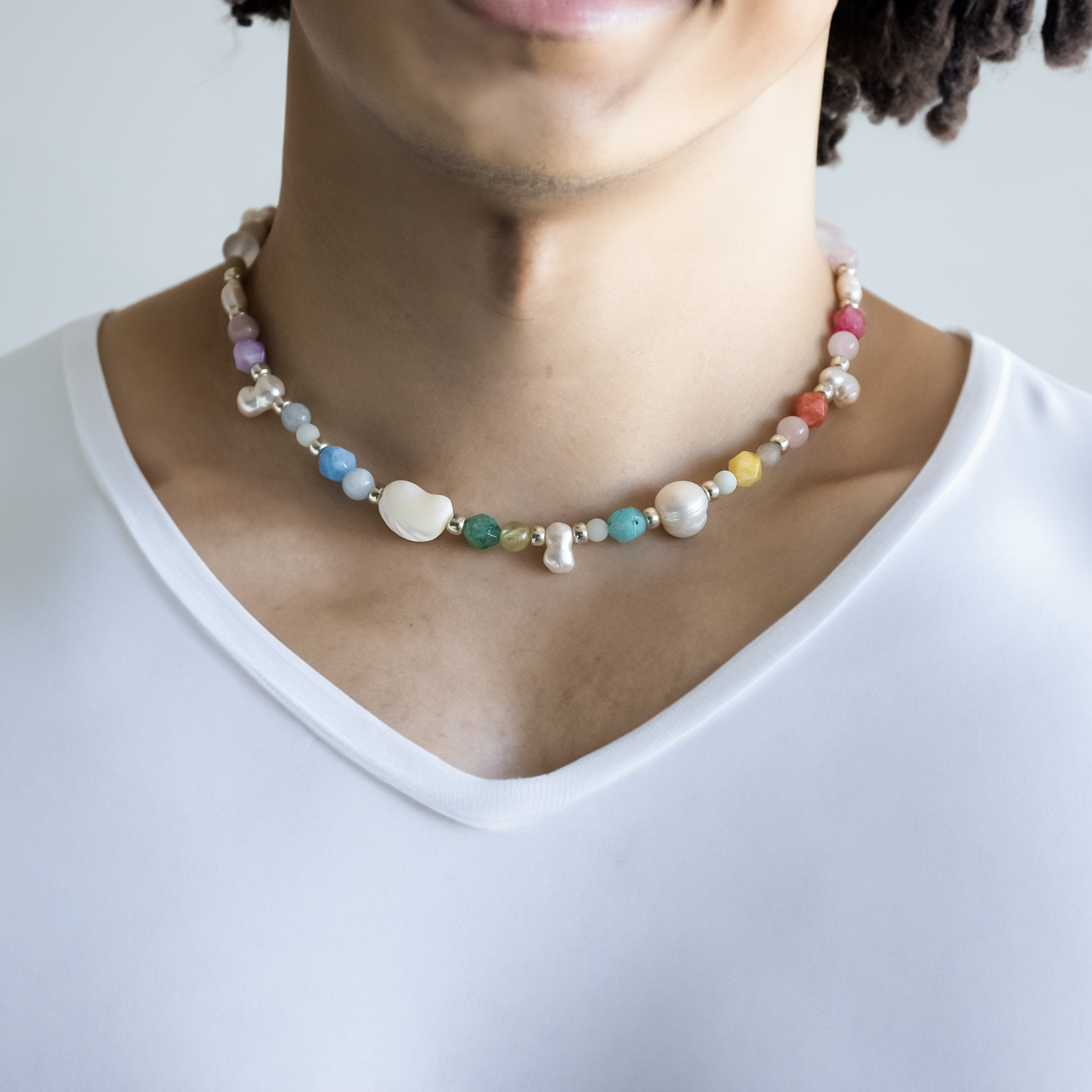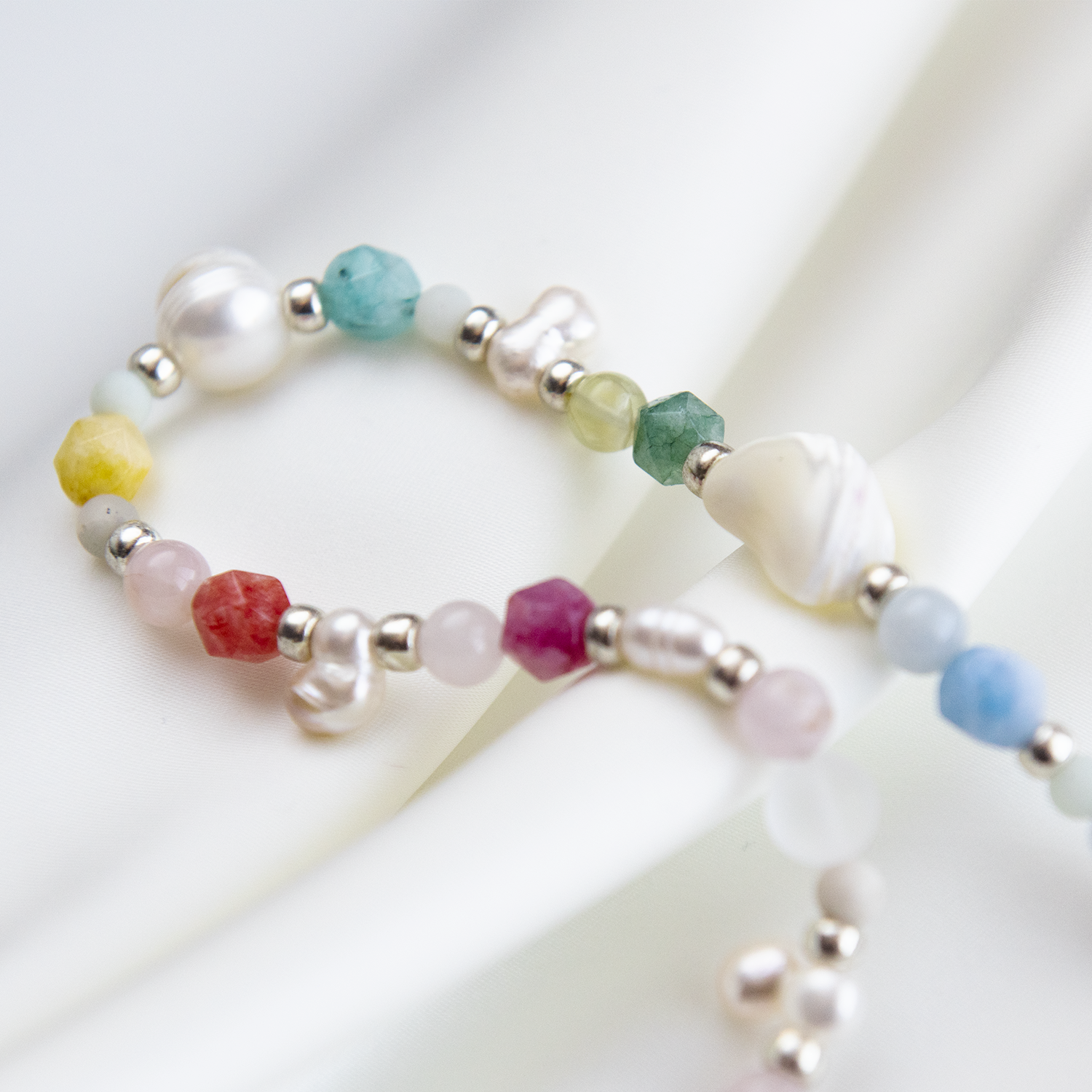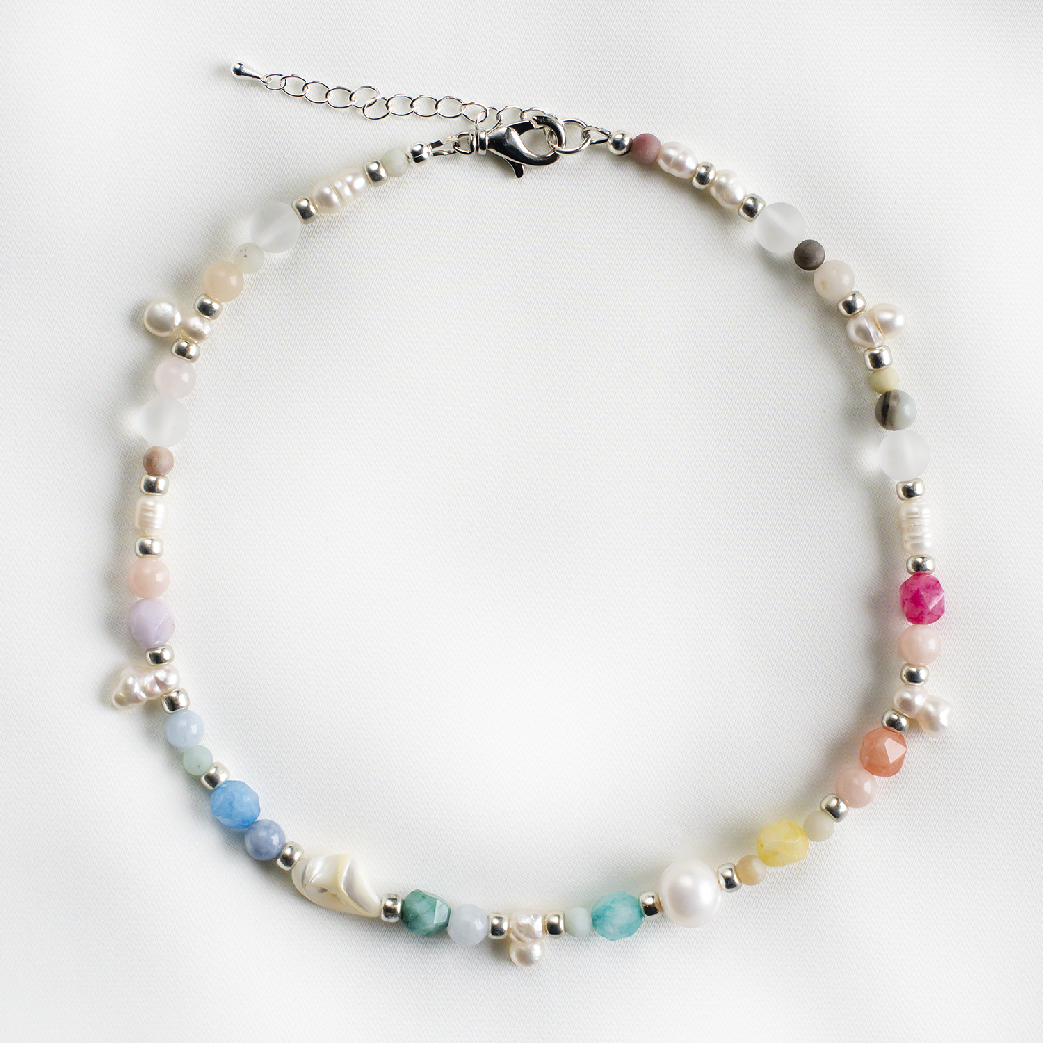 Made with freshwater pearl, quartz, morganite, amazonite, shell, miyuki beads, and silver plated hardware.