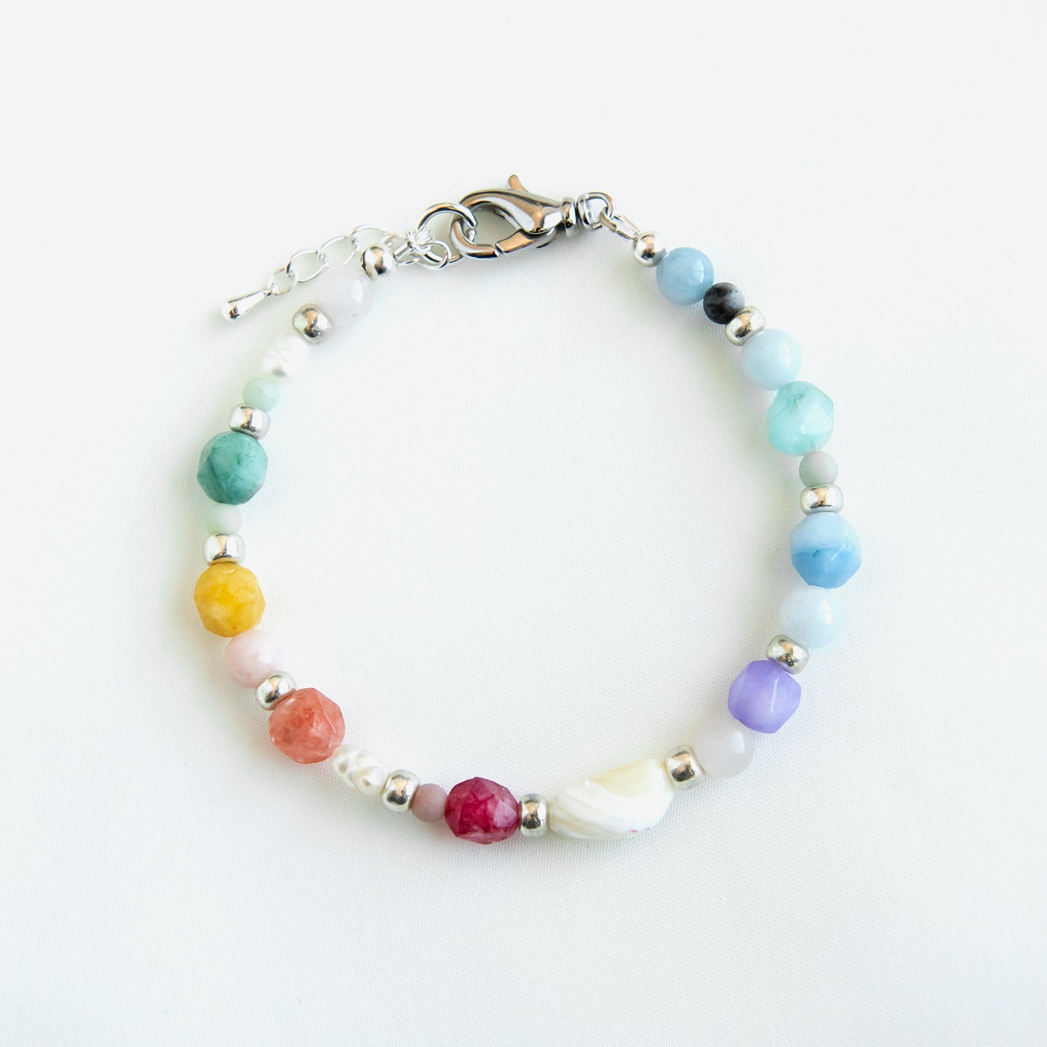 Made with freshwater pearl, quartz, morganite, amazonite, shell, miyuki beads, and silver plated hardware.