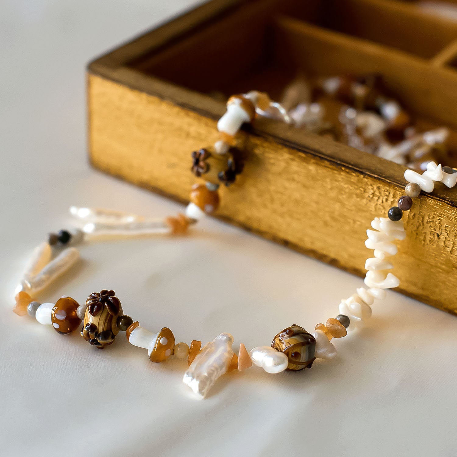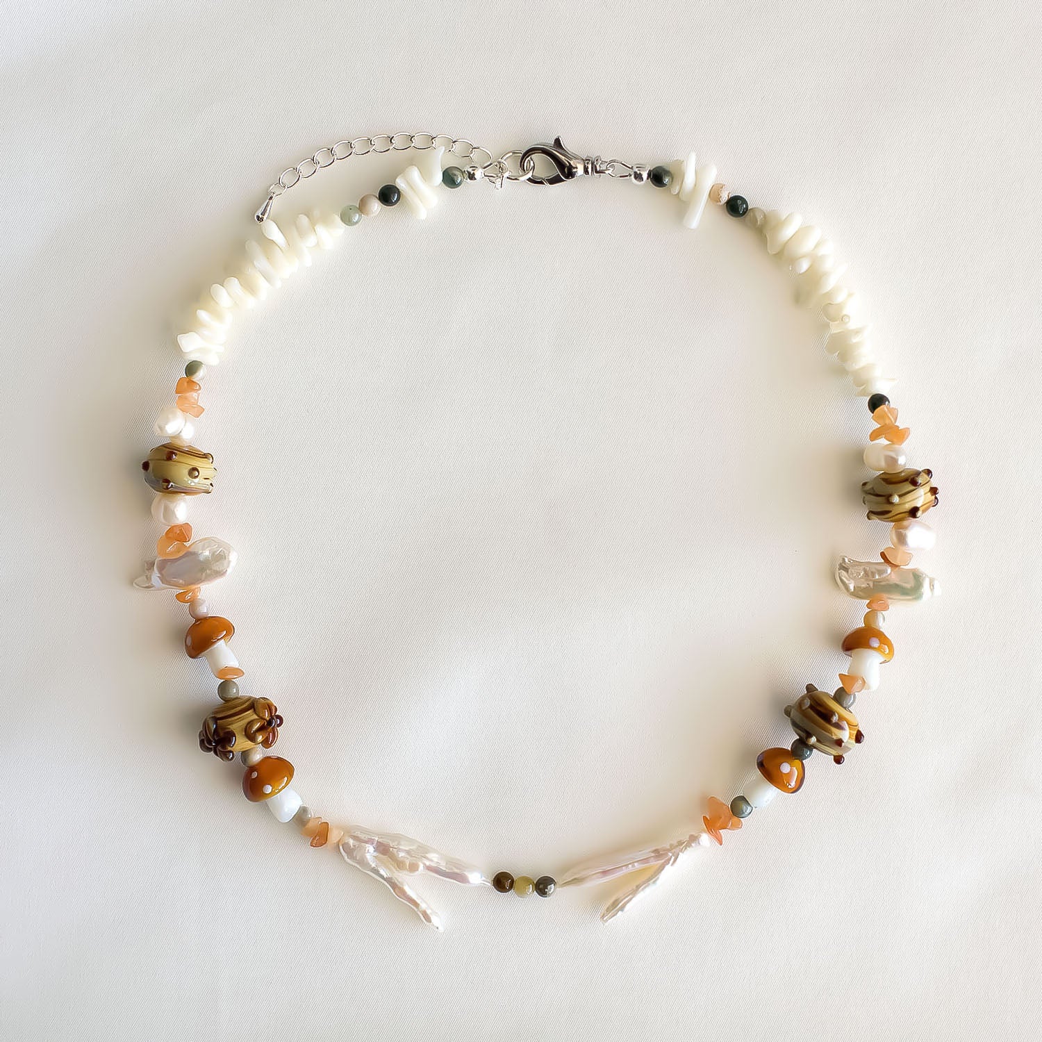 Made with freshwater pearls, delicate lampwork beads, aventurine, ocean jasper, coral and silver plated hardware.
