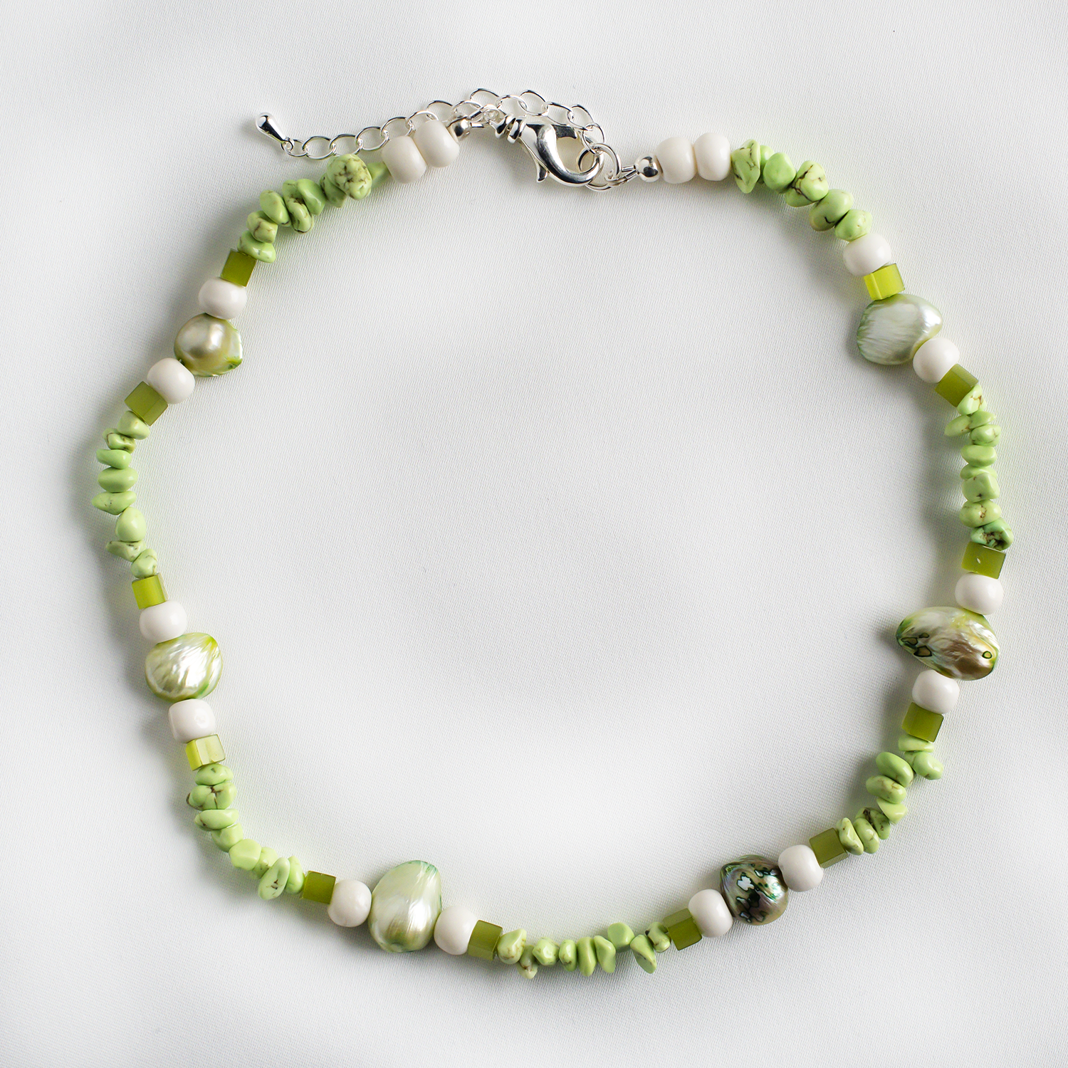 Made with coloured pearl, serpentine jasper, bone beads and silver plated hardware.
