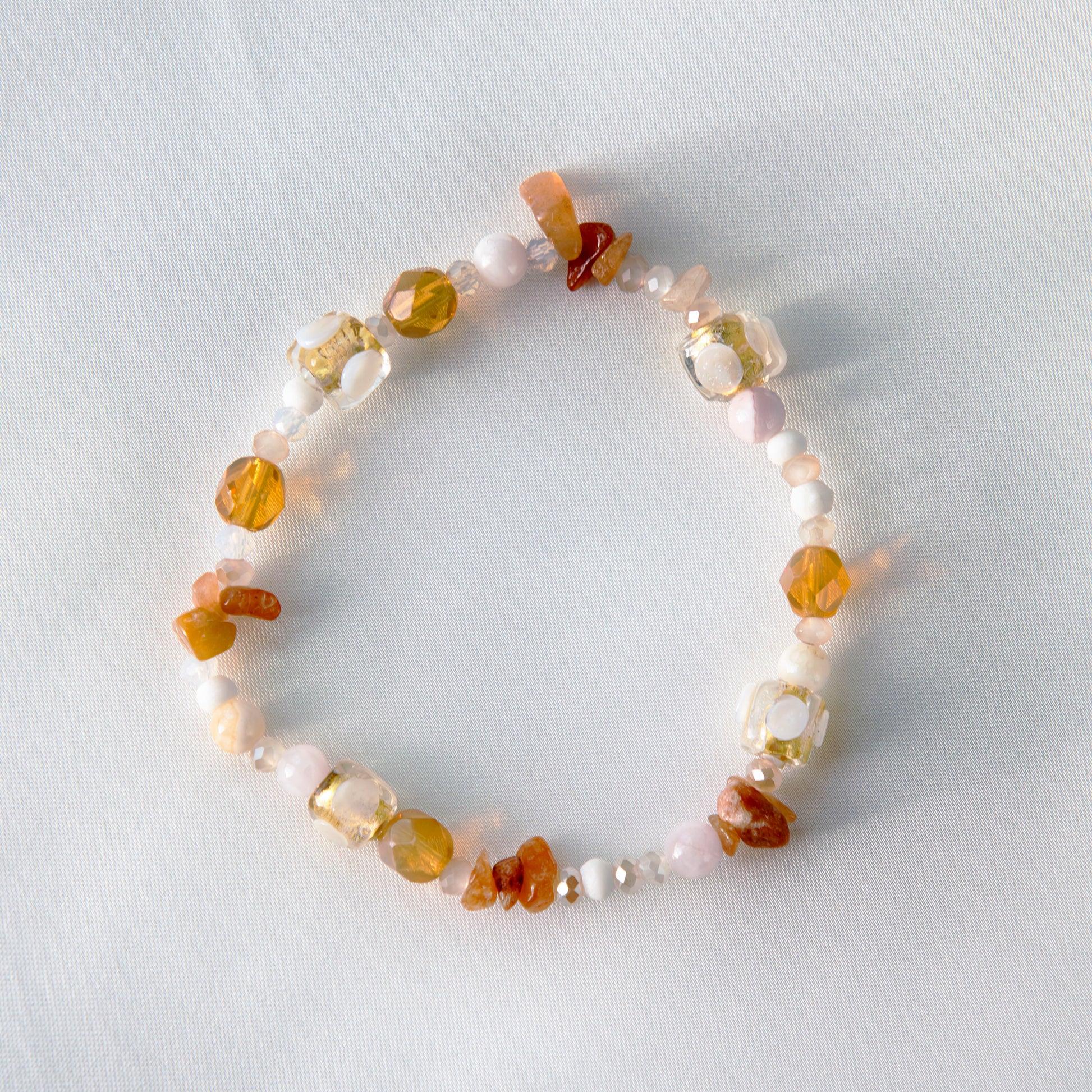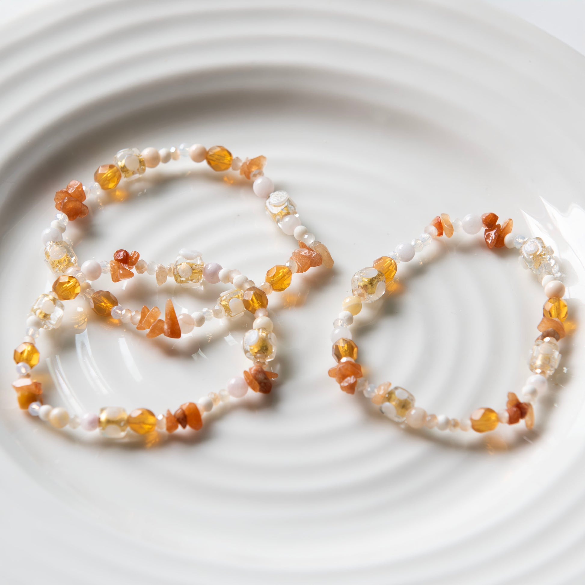 Morae [ˈmoː.rɛ] (Sand in Korean): Inspired by the sun-warmed grains of sand, the Morae Bracelet features a soothing palette of gold glass beads, topaz, aventurine and crystals. Each element evokes the tranquility of a beach stroll, making this bracelet a reminder of nature's simple pleasures.