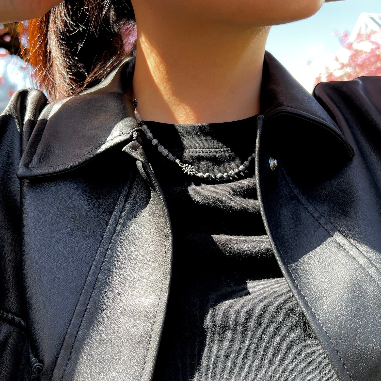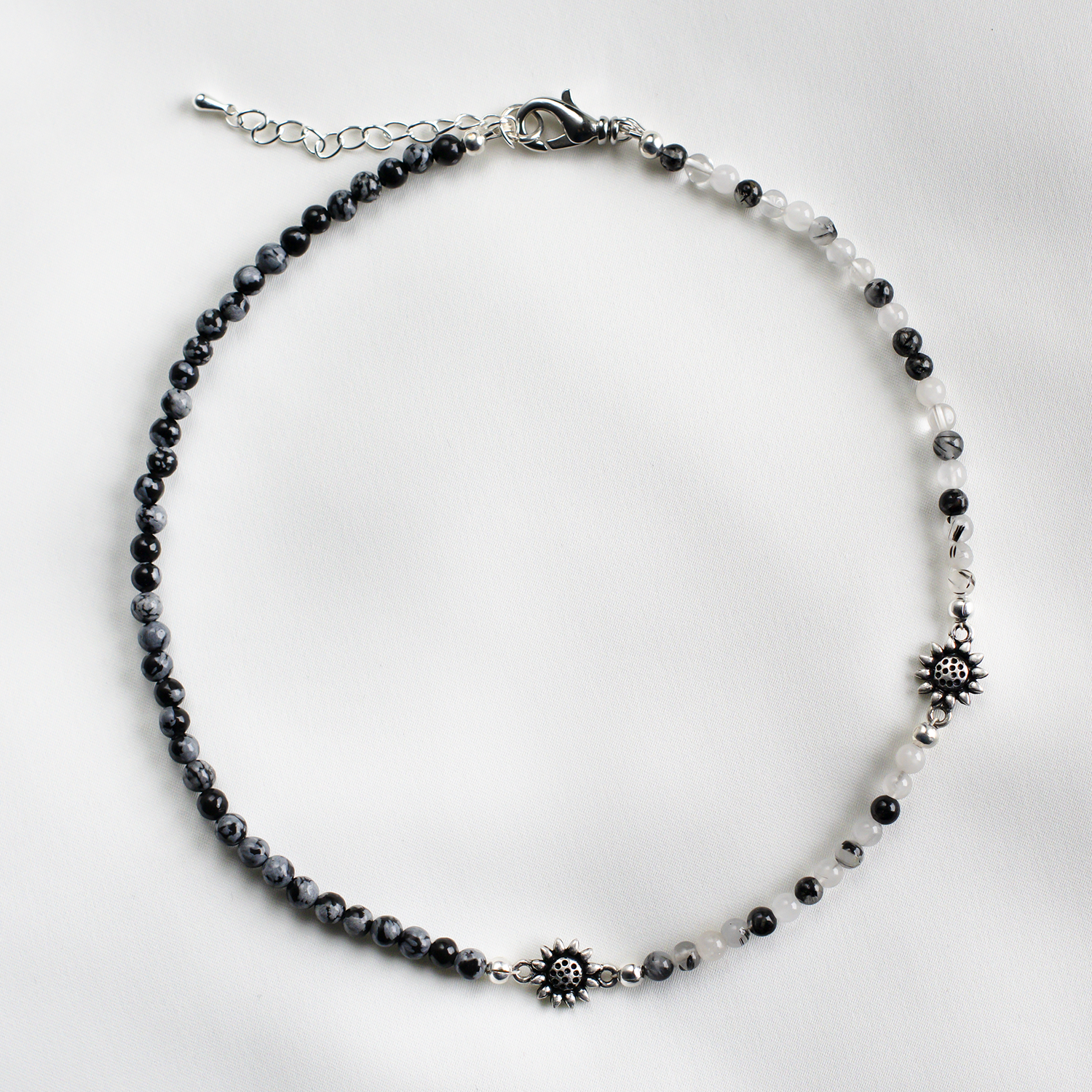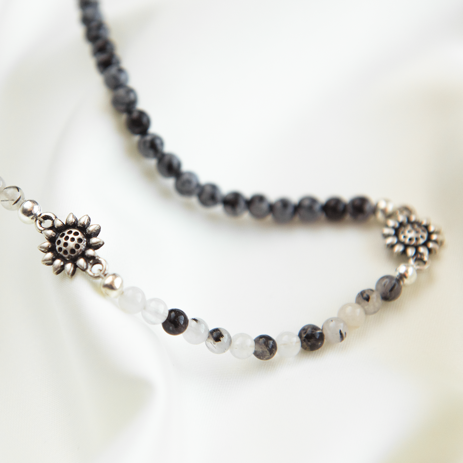 Made with obsidian, tourmaline quartz, pewter pendants, and silver plated hardware.