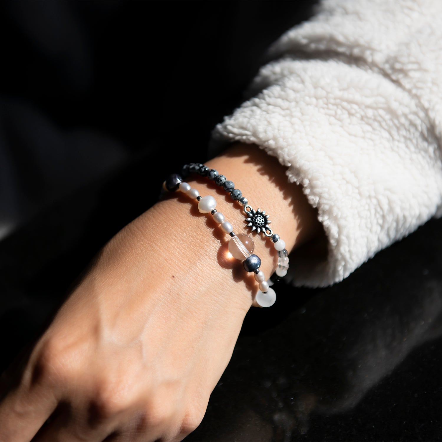 Each piece is unique and handmade, with variations in the placement of the beads.