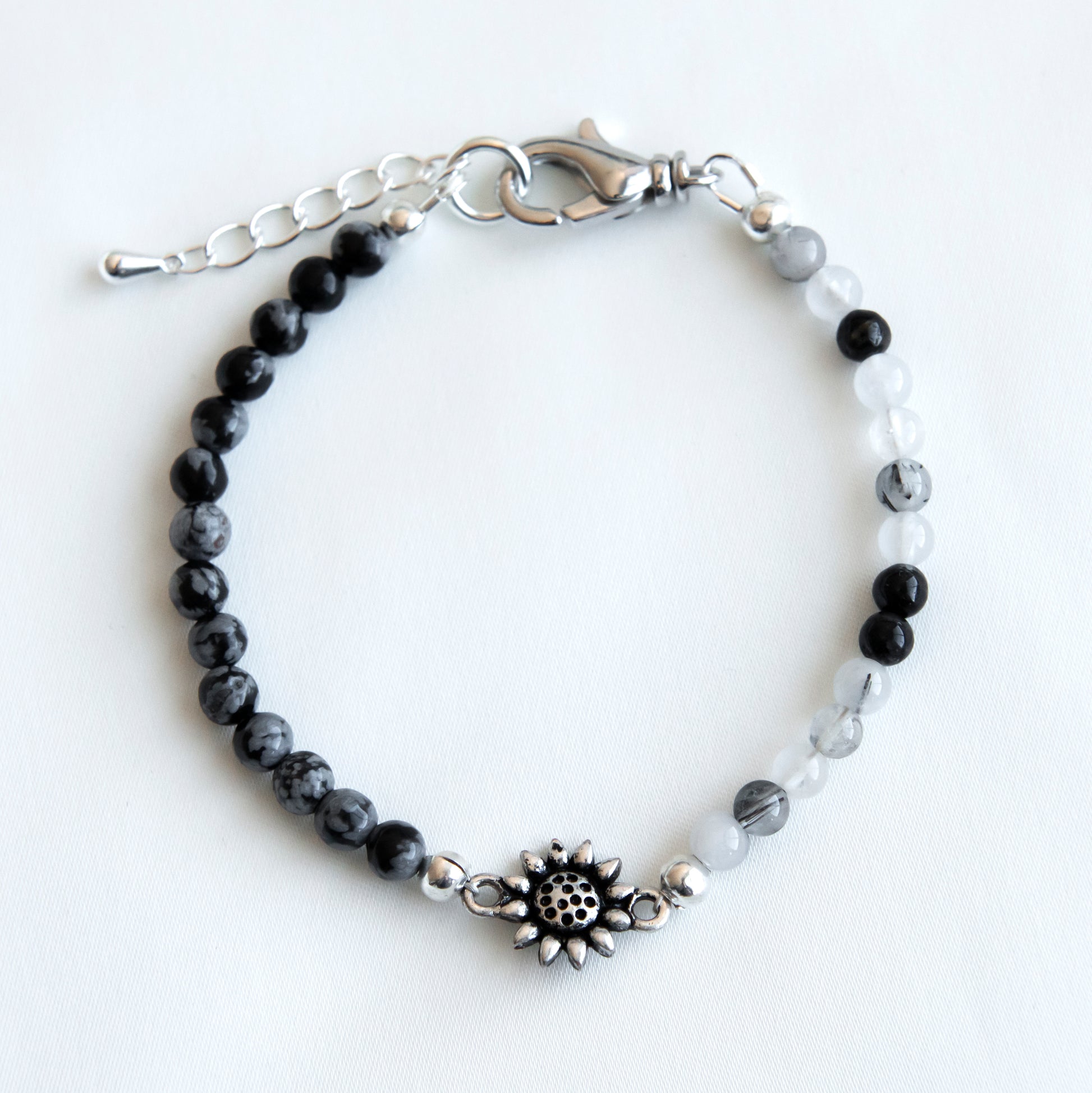 Made with obsidian, tourmaline quartz, pewter pendants, and silver plated hardware.