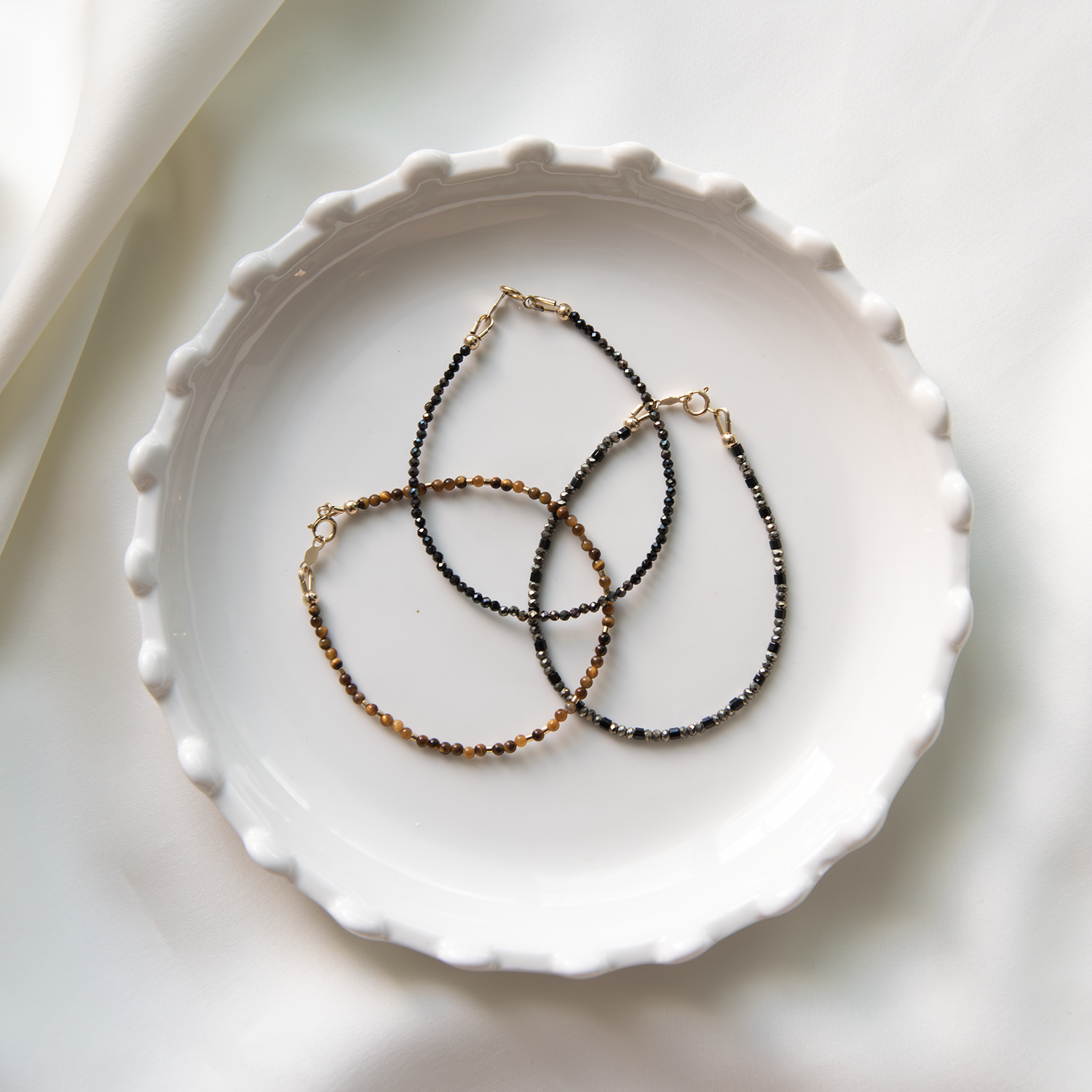 Each piece is unique and handmade, with variations in the placement of the beads.