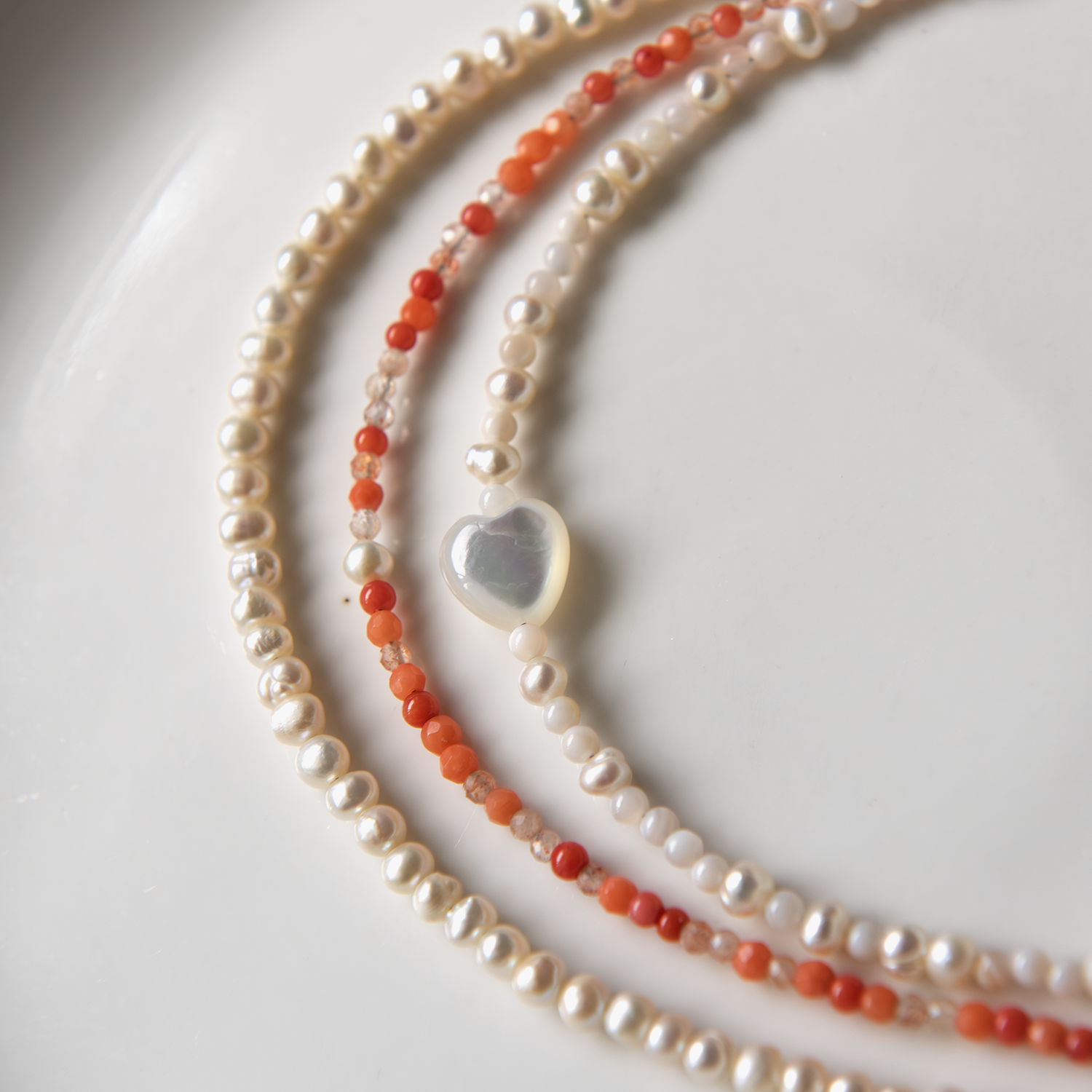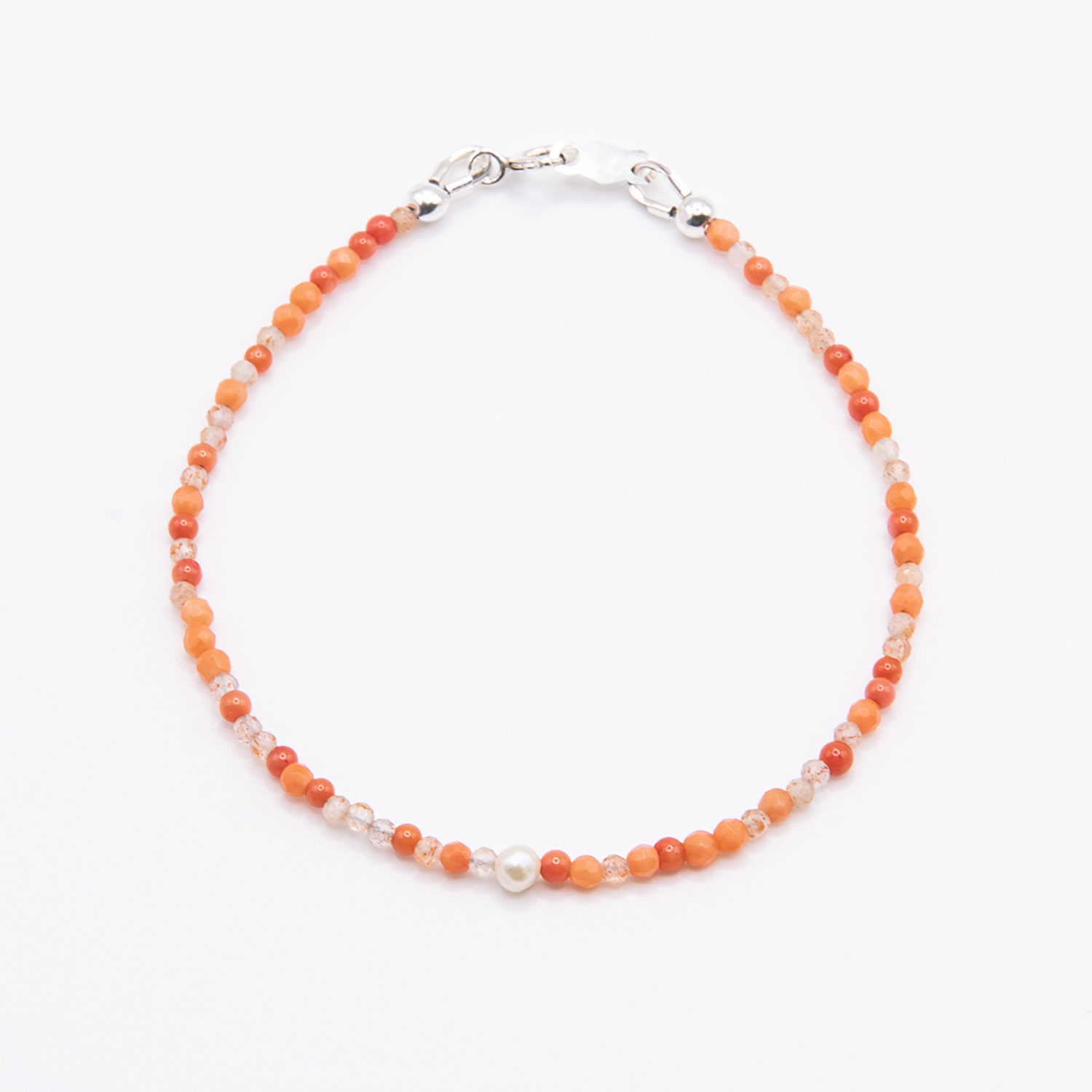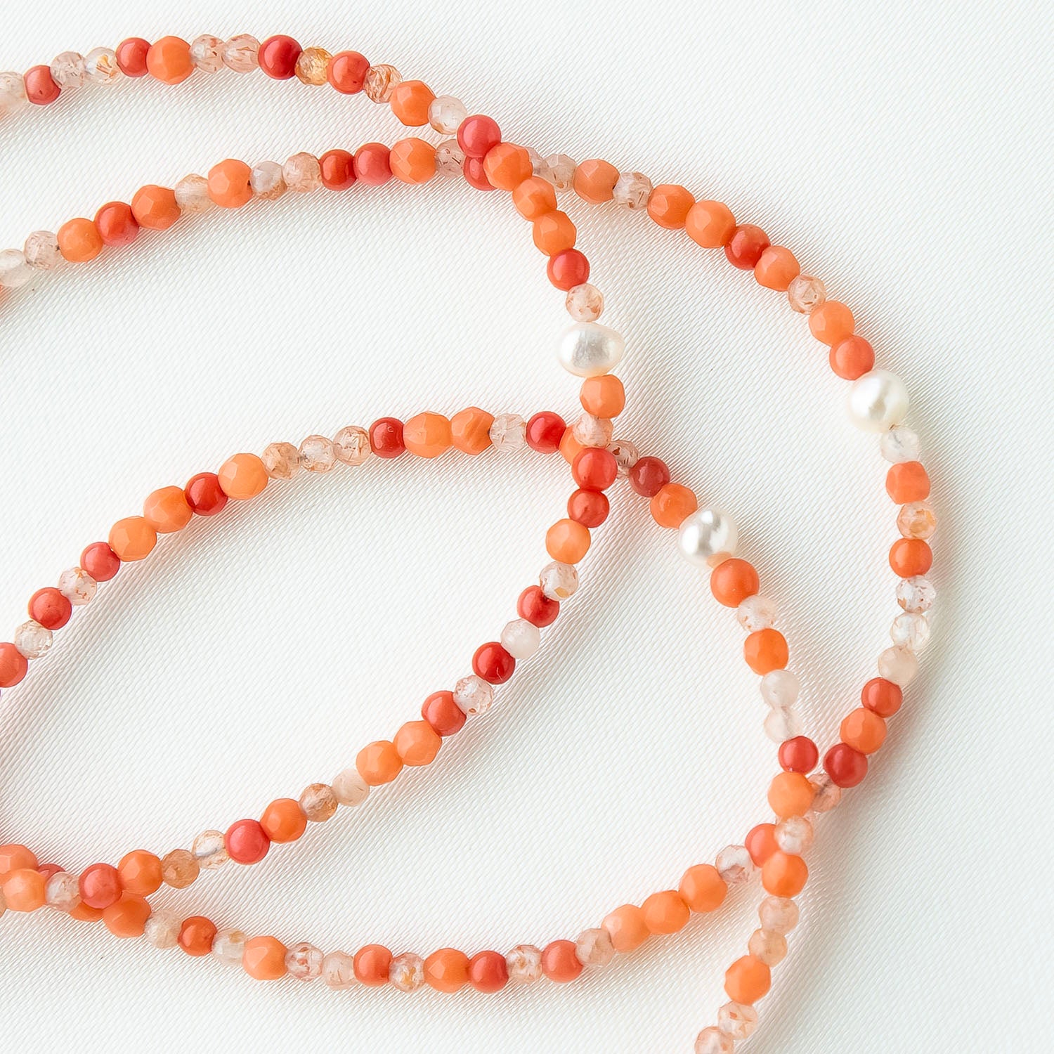 Made with sunstone, coral beads, and freshwater pearl, and gold filled/sterling silver hardware.