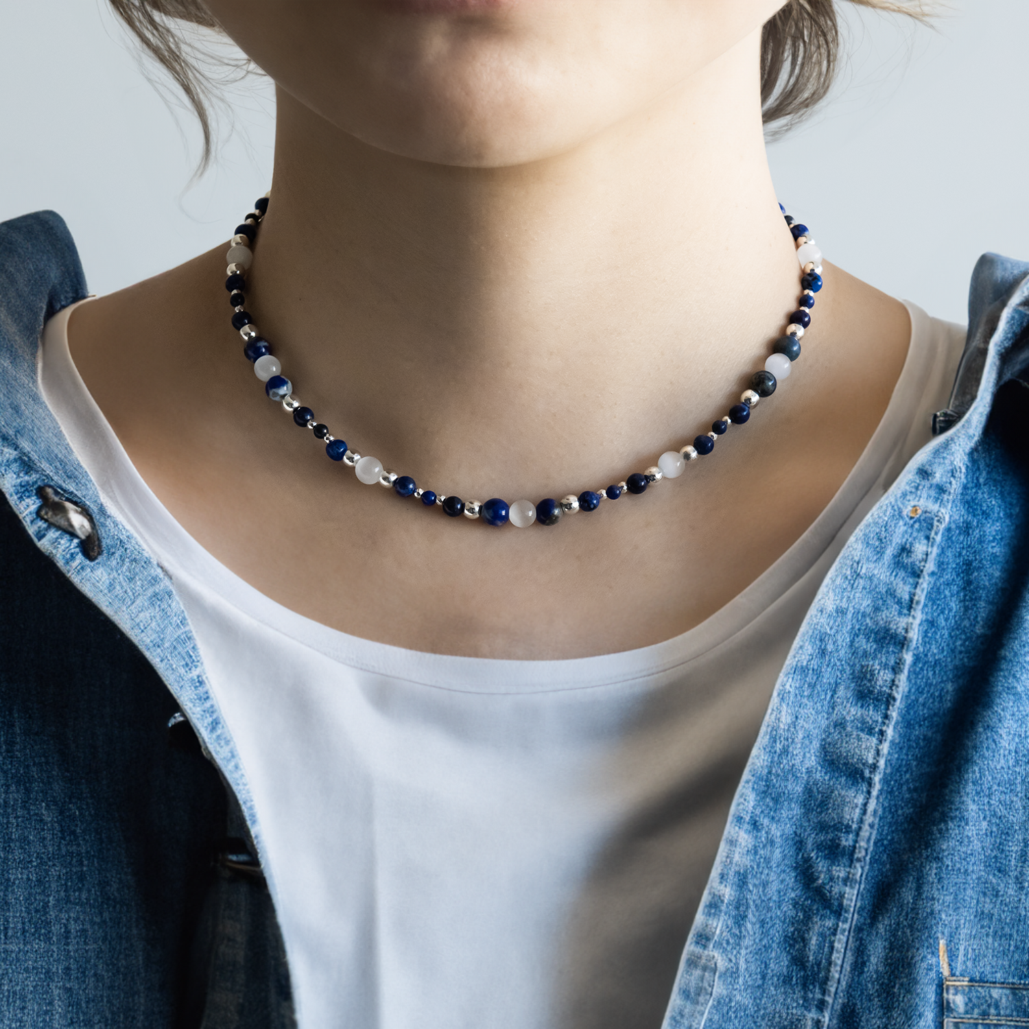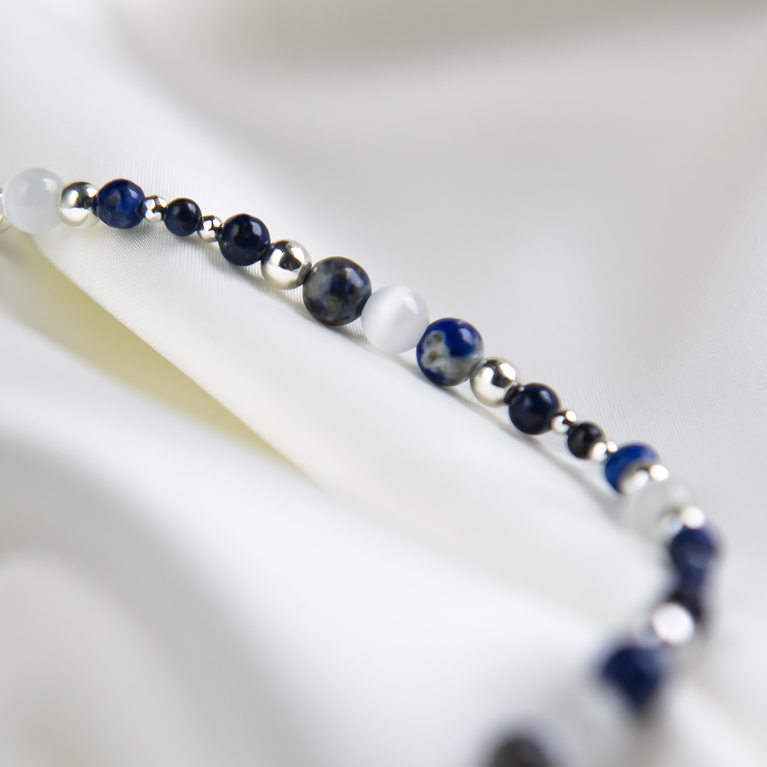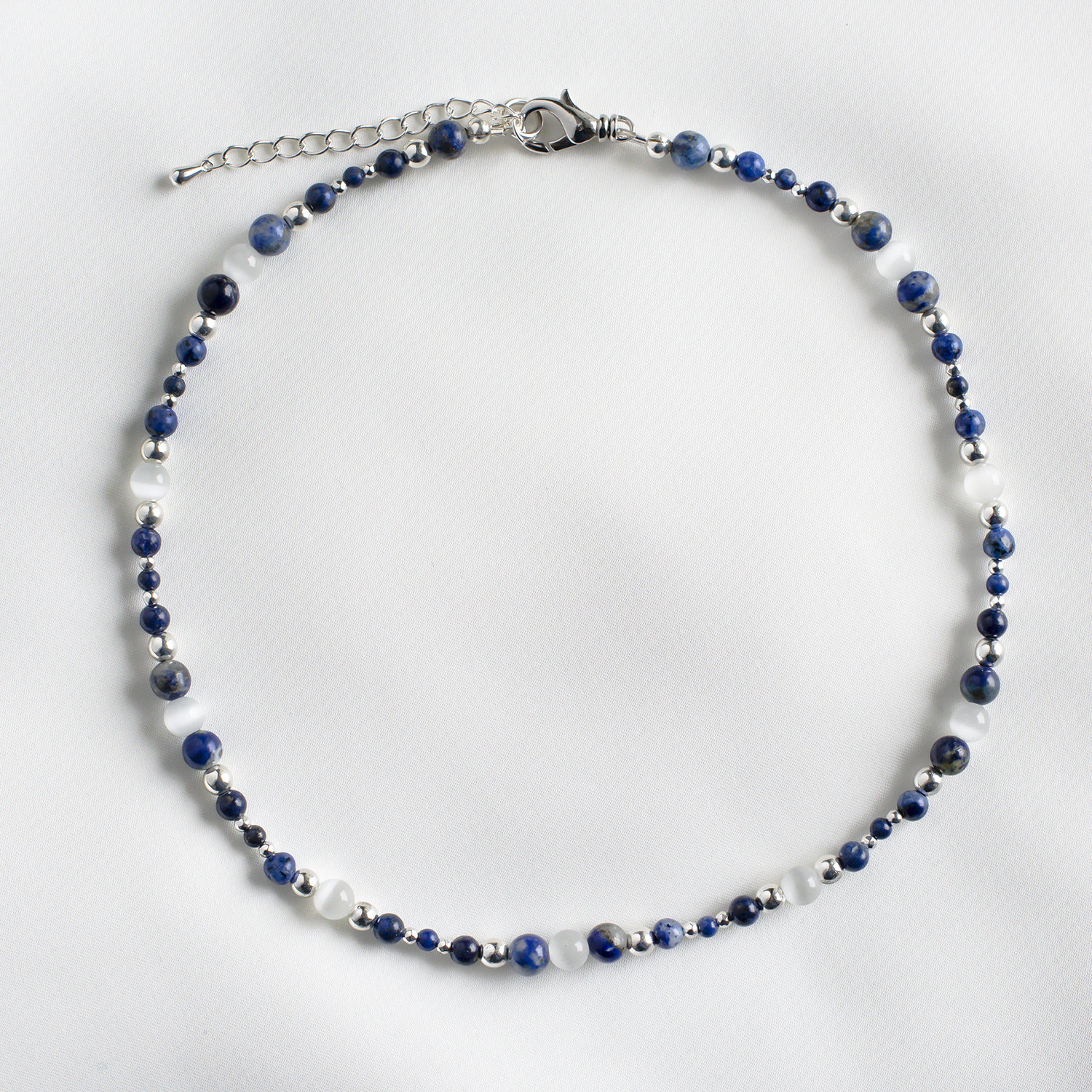 Made with lapis lazuli, hematite, cateye beads and silver plated hardware.