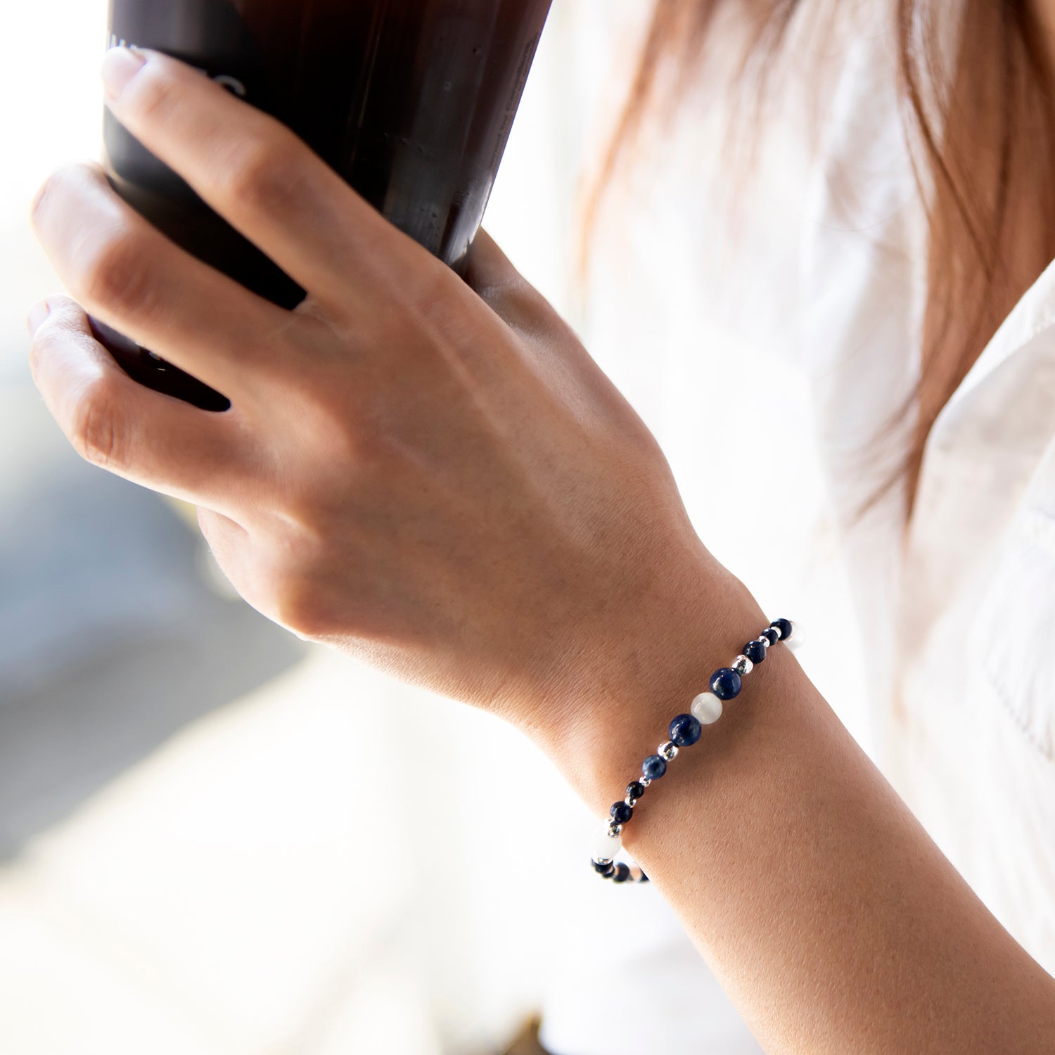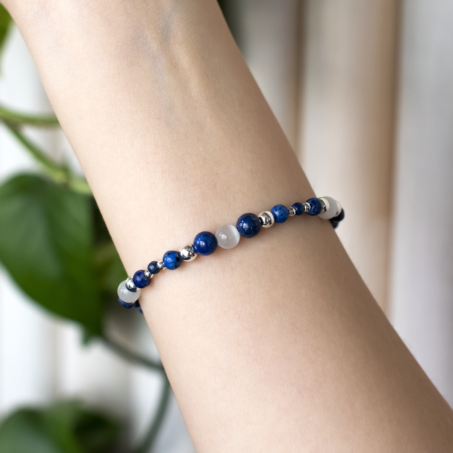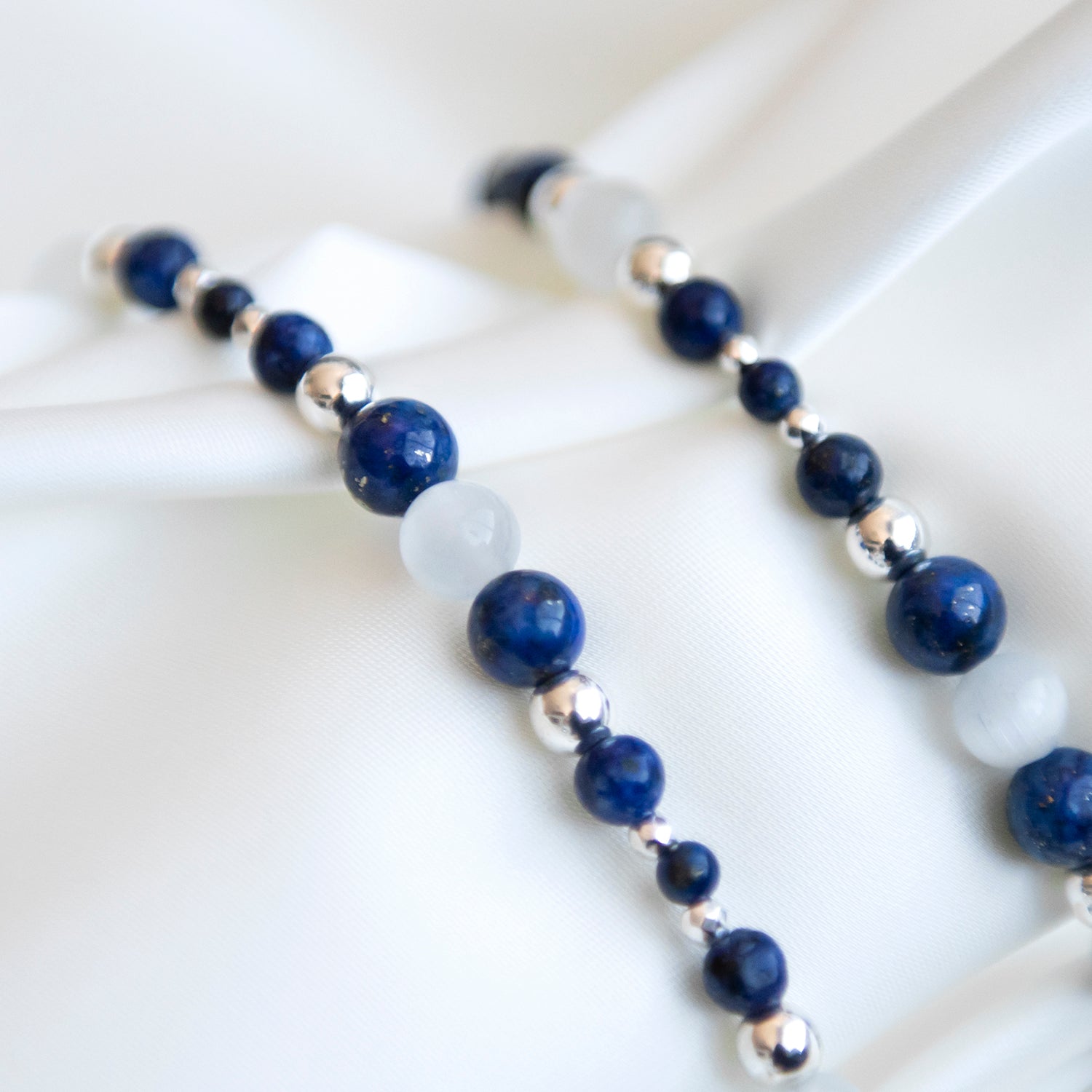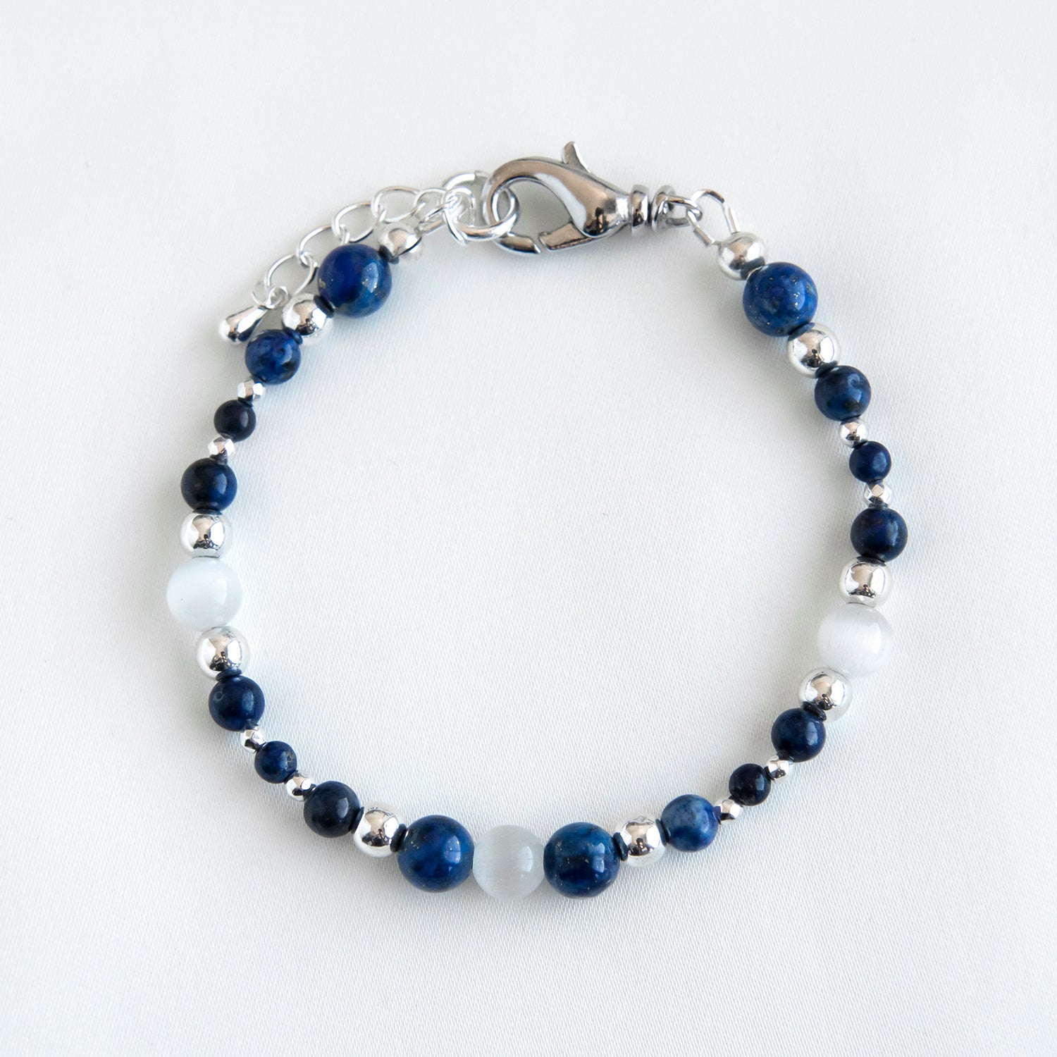 Made with lapis lazuli, hematite, cateye beads and silver plated hardware.