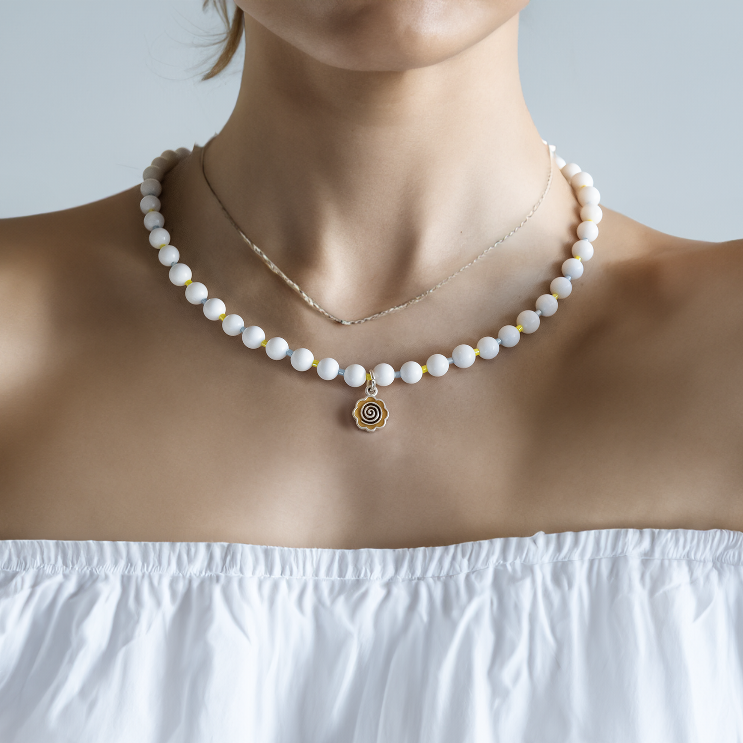 Made with tridacna, pewter pendant, miyuki beads and silver plated hardware.