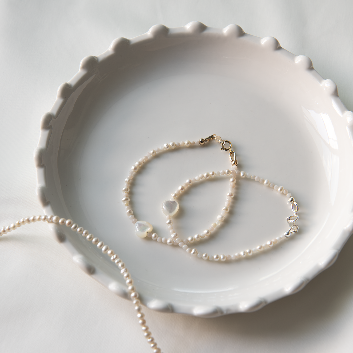 Made with pearl, shell, mother of pearl, and gold filled/sterling silver hardware.